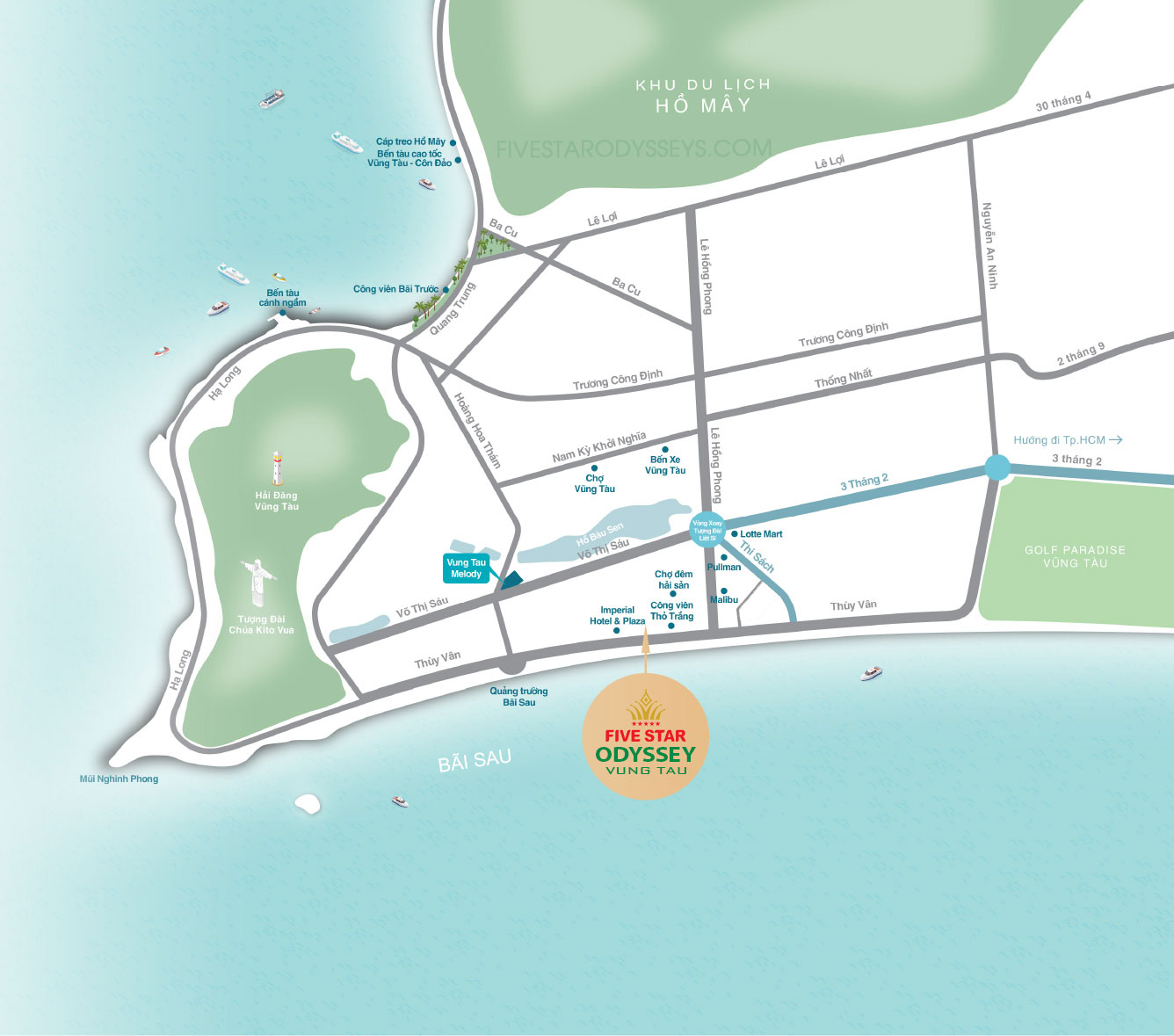 ► Tọa lạc tại 165 Thùy Vân, Five Star Odyssey nắm giữ vị trí vàng hiếm có – nằm ngay trên trục đường ven biển đẹp nhất Vũng Tàu, nơi tập trung các khách sạn và khu nghỉ dưỡng cao cấp như The Imperial, Pullman, Golf Paradise, Green World Resort, cùng hệ thống nhà hàng, bar, phố đêm, và khu vui chơi giải trí sầm uất.