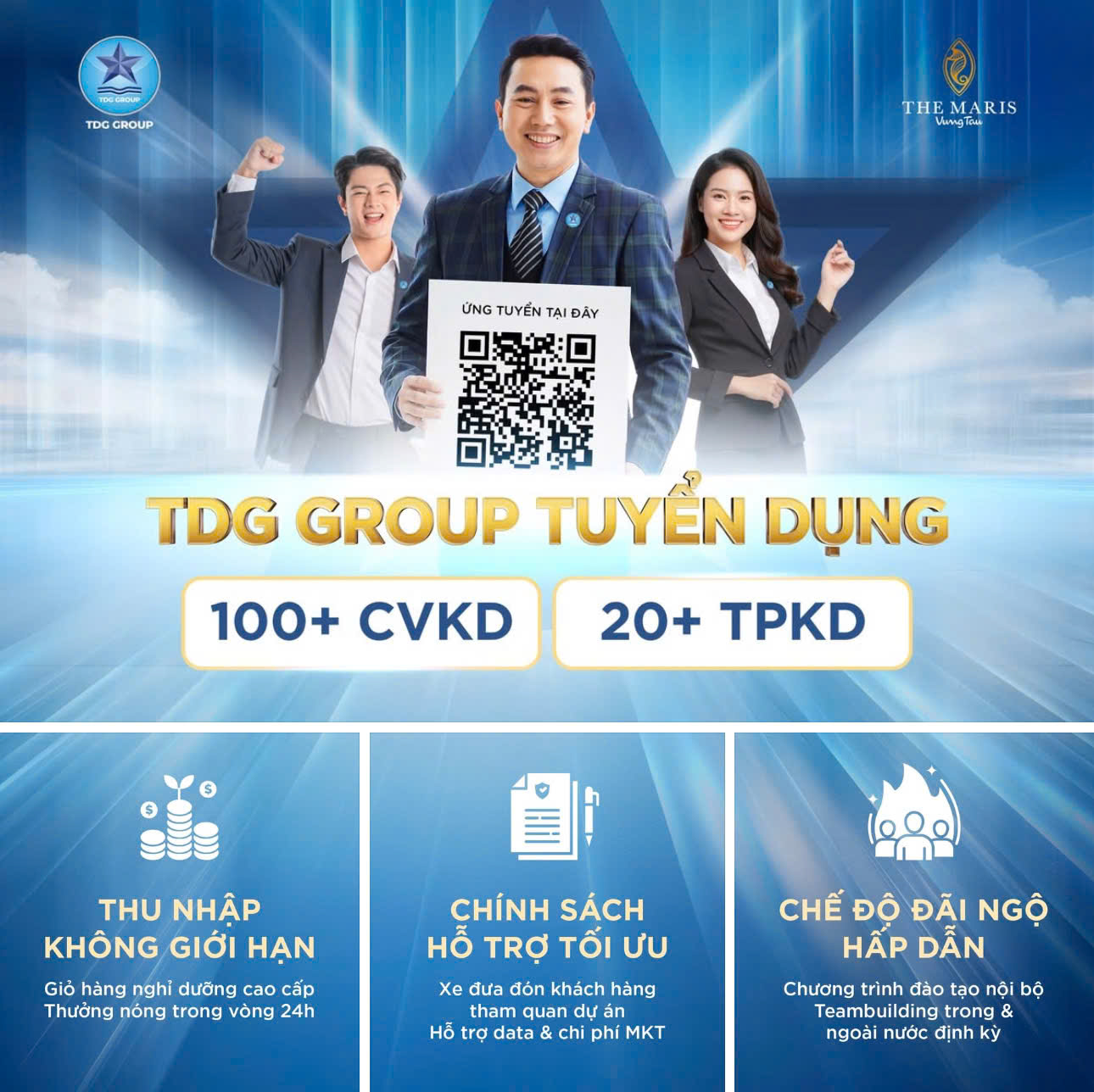 ► TDG Group tuyển dụng 2026 chính thức mở rộng quy mô nhân sự, tìm kiếm hơn 100 chiến binh kinh doanh bất động sản nghỉ dưỡng cao cấp, cùng triển khai hơn 3.000 sản phẩm biển tại siêu dự án The Maris Vũng Tàu. Đây là cơ hội vàng cho những ai khát khao bứt phá thu nhập, xây dựng sự nghiệp vững chắc trong ngành bất động sản cao cấp.