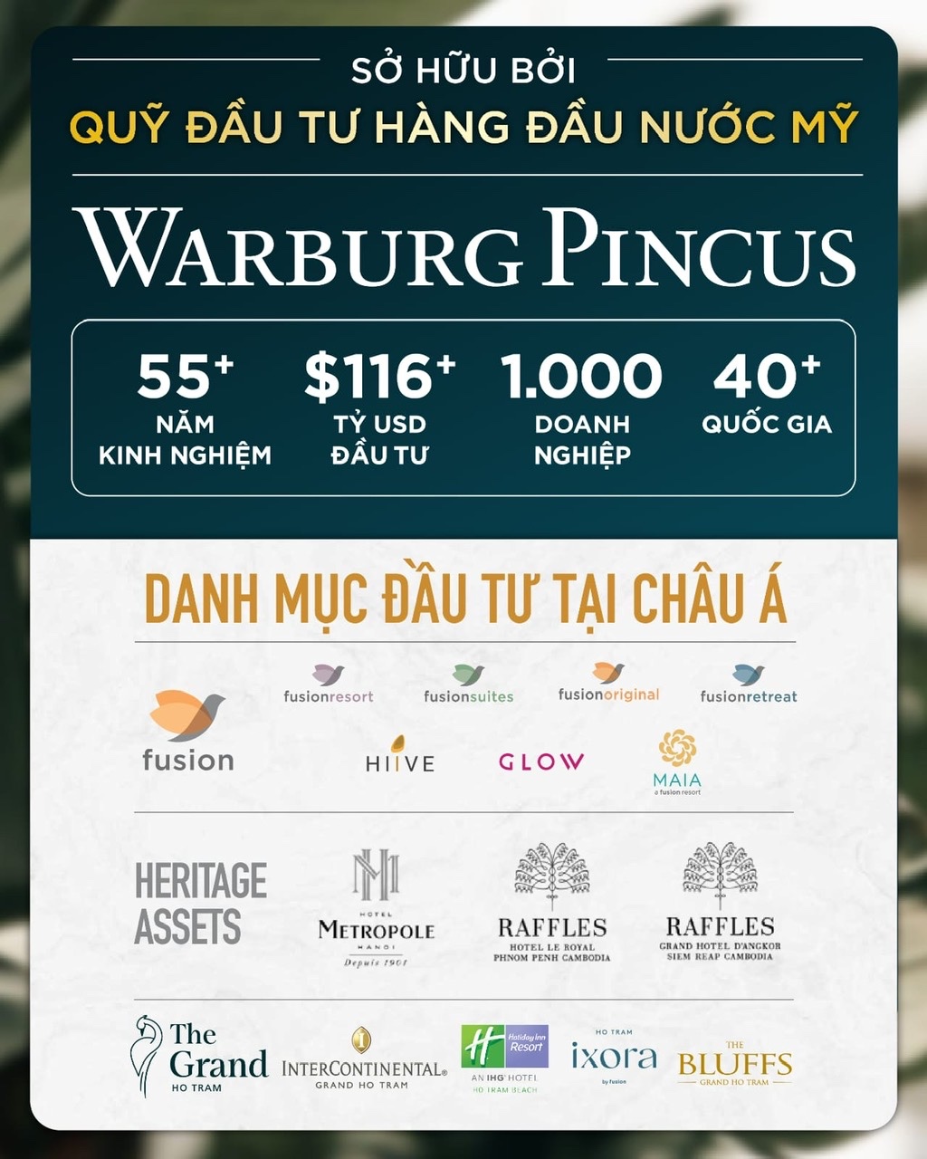 → Chủ đầu tư là Công ty TNHH Dự án Hồ Tràm (HTP) – đơn vị có tiềm lực mạnh, từng phát triển nhiều khu nghỉ dưỡng cao cấp, hợp tác cùng Fusion Hotel Group và InterContinental.