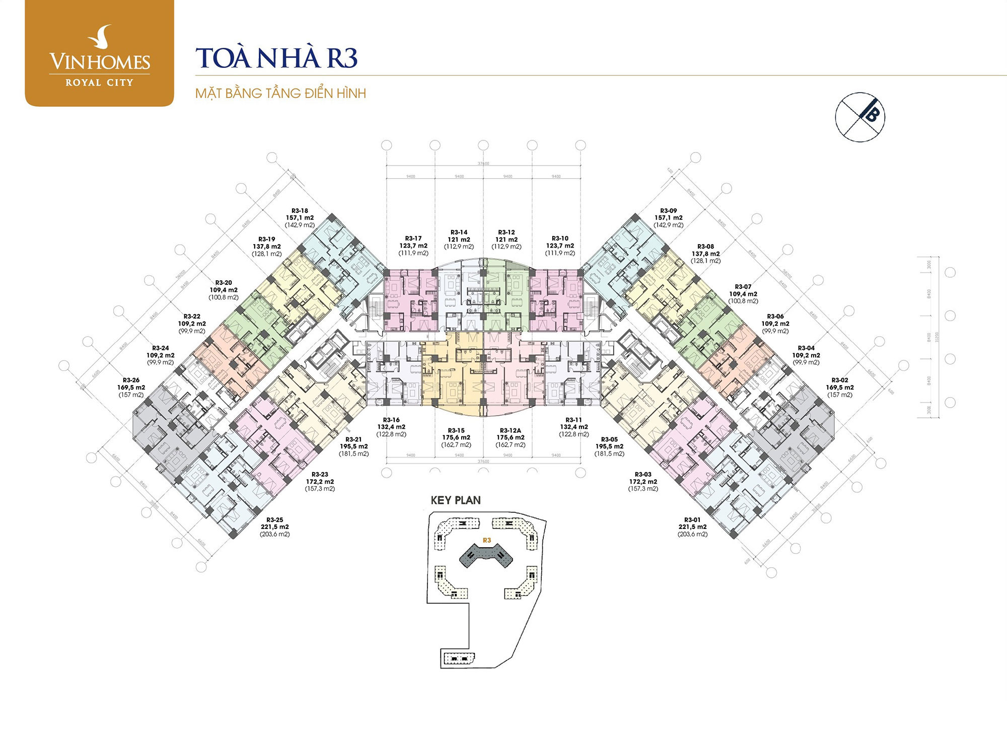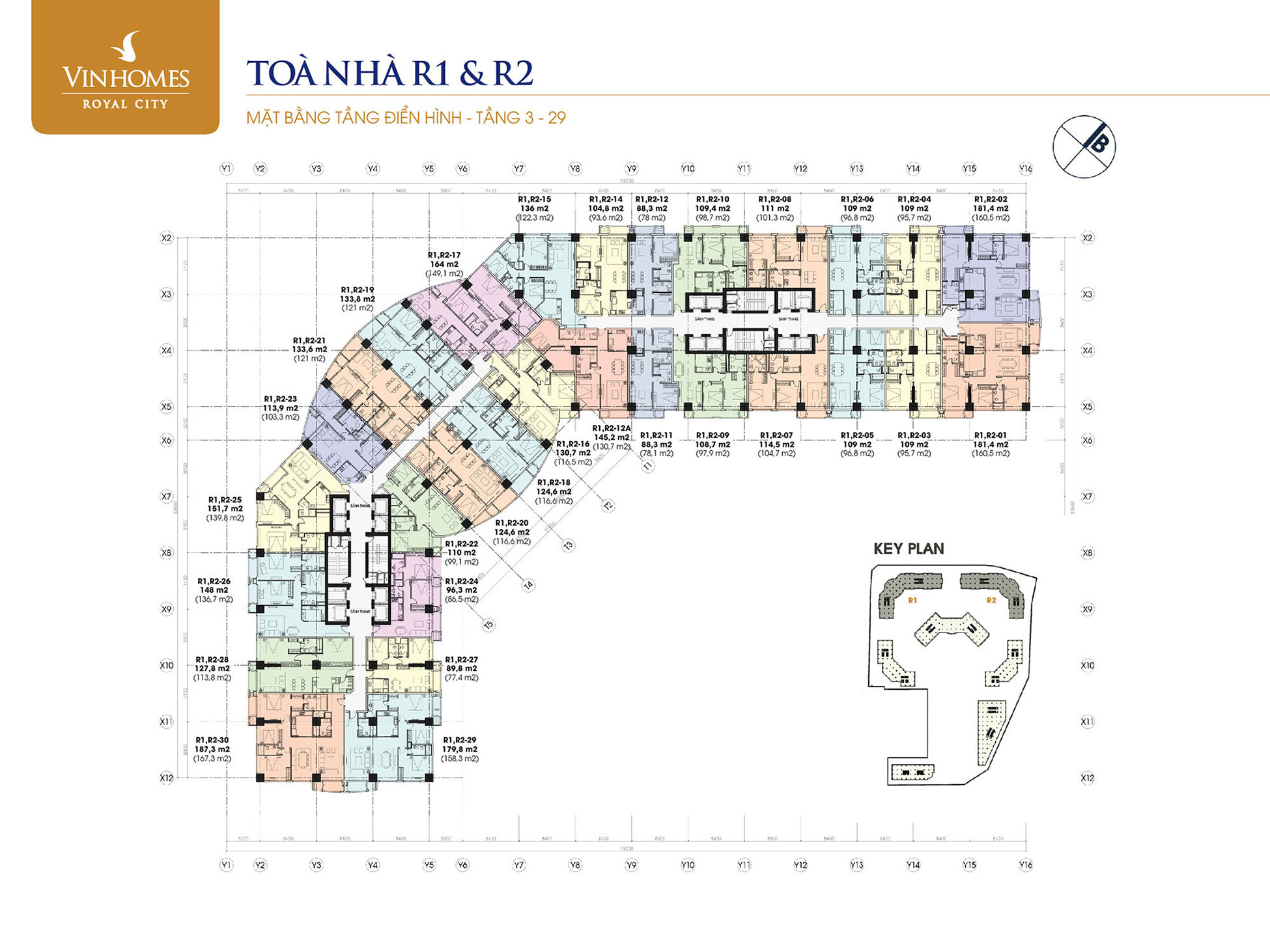 ⇒ Dự án gồm 6 tòa R1 – R6 bố trí hình vòng cung, tạo không gian mở và tối ưu ánh sáng tự nhiên cho từng căn hộ.